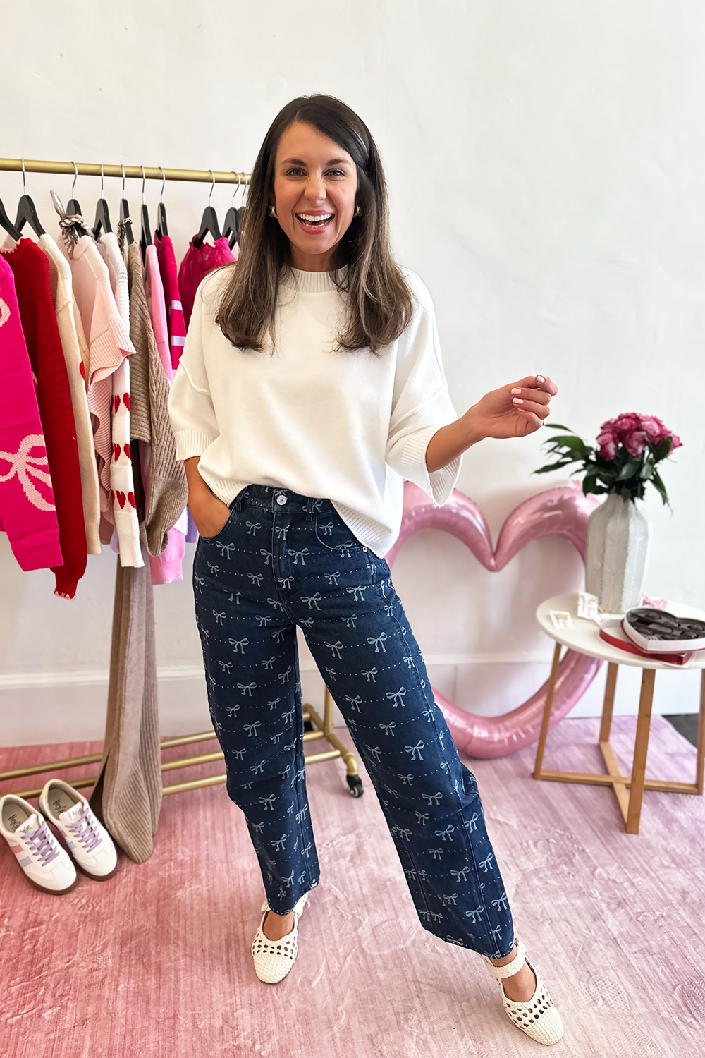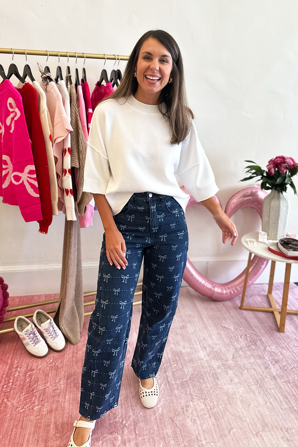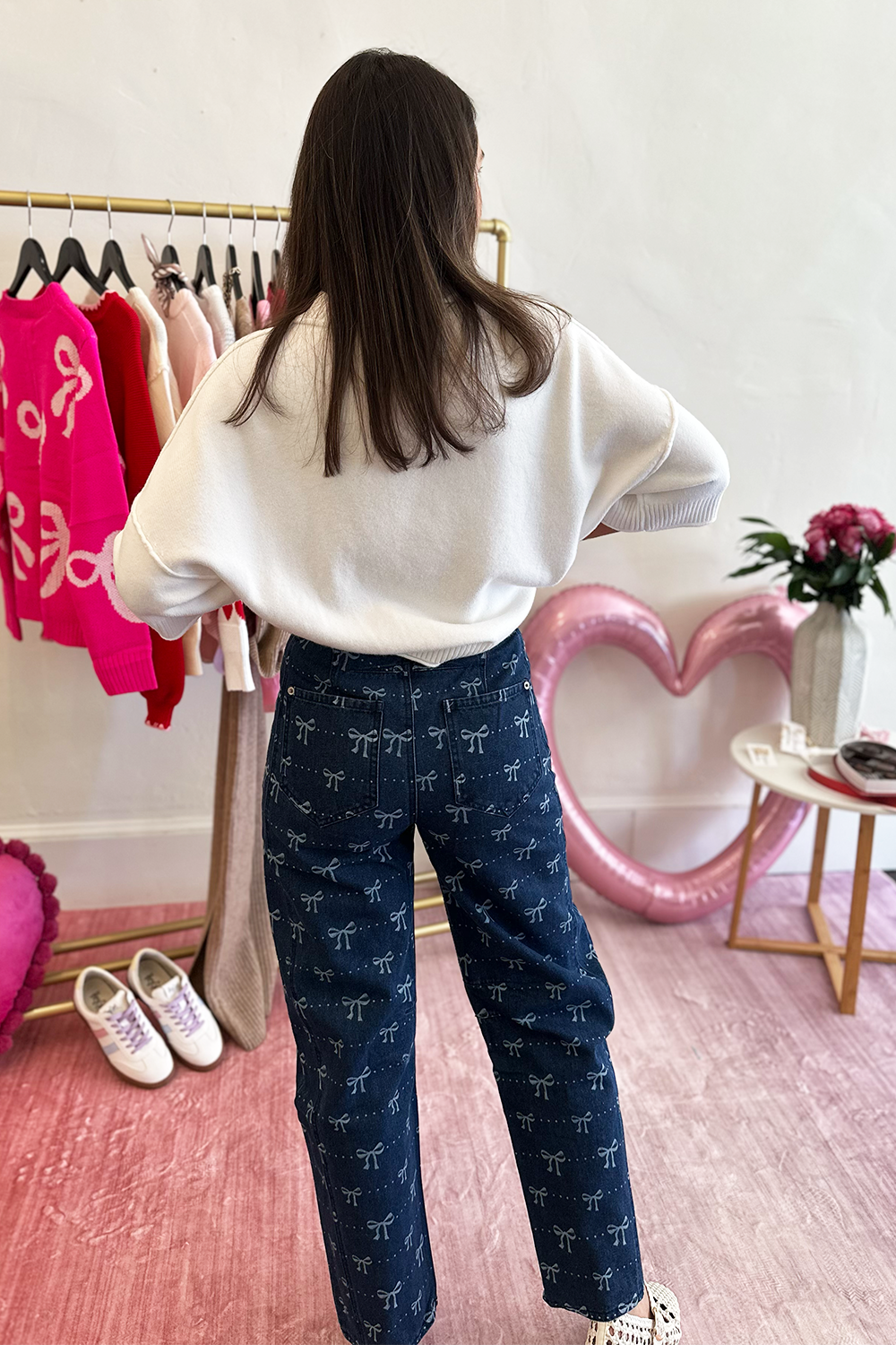 Elevate your denim collection with these unique barrel jeans featuring charming bow print detailing. The modern barrel silhouette offers a fresh alternative to traditional denim cuts, with a relaxed fit through the hips and thighs that tapers at the ankle for a contemporary, flattering shape.