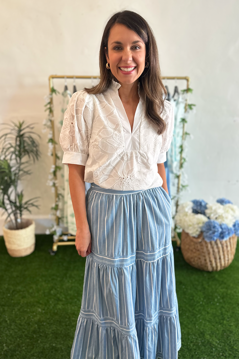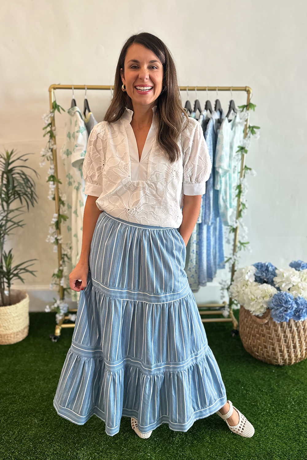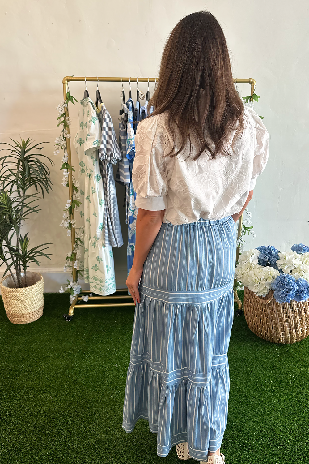 The Blue and White Stripe Midi Skirt is the kind of wardrobe staple that never goes out of style. Clean nautical stripes, a flattering midi length, and 100% cotton fabric make this skirt as comfortable as it is chic — perfect for warm days when you want to look effortlessly put-together.