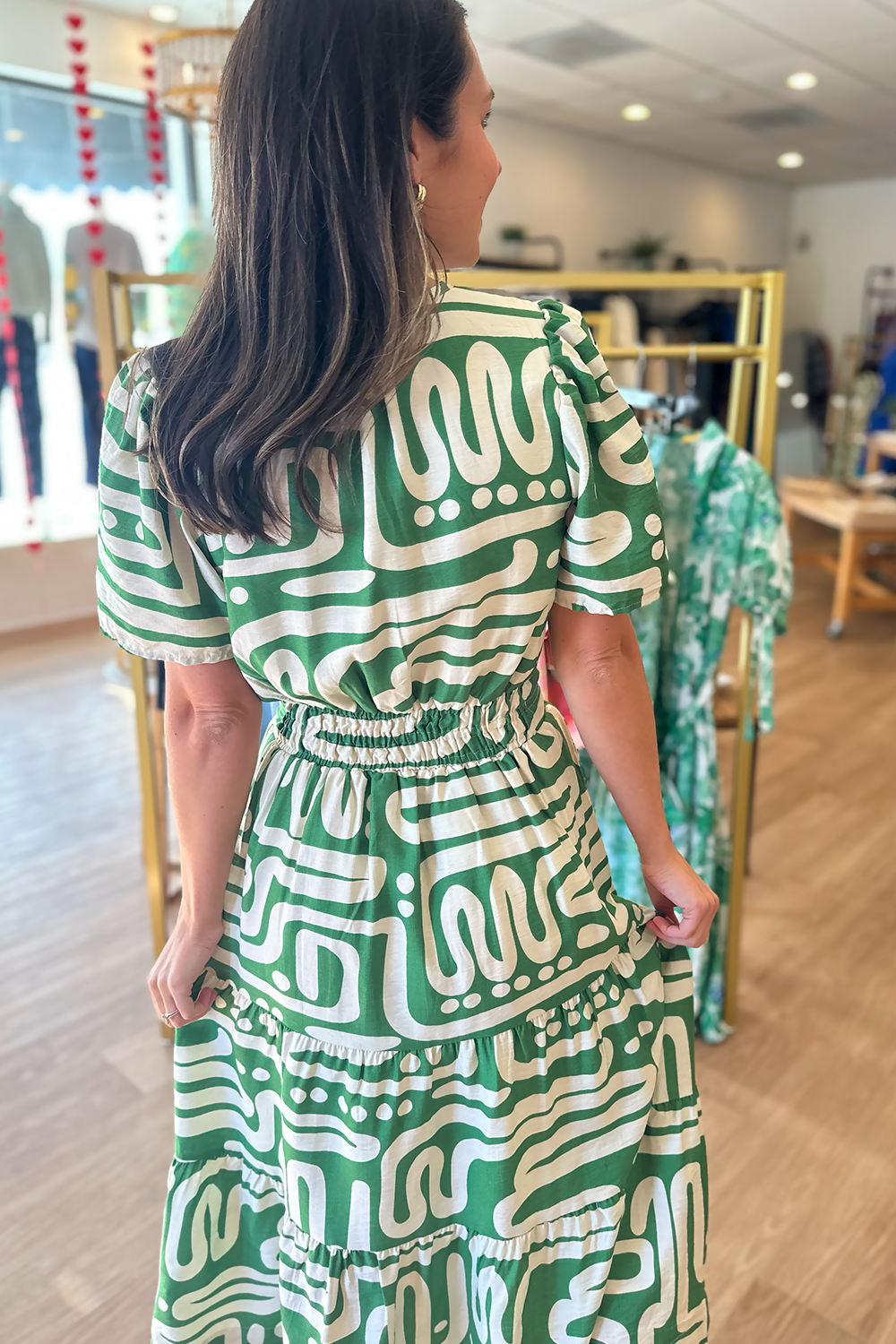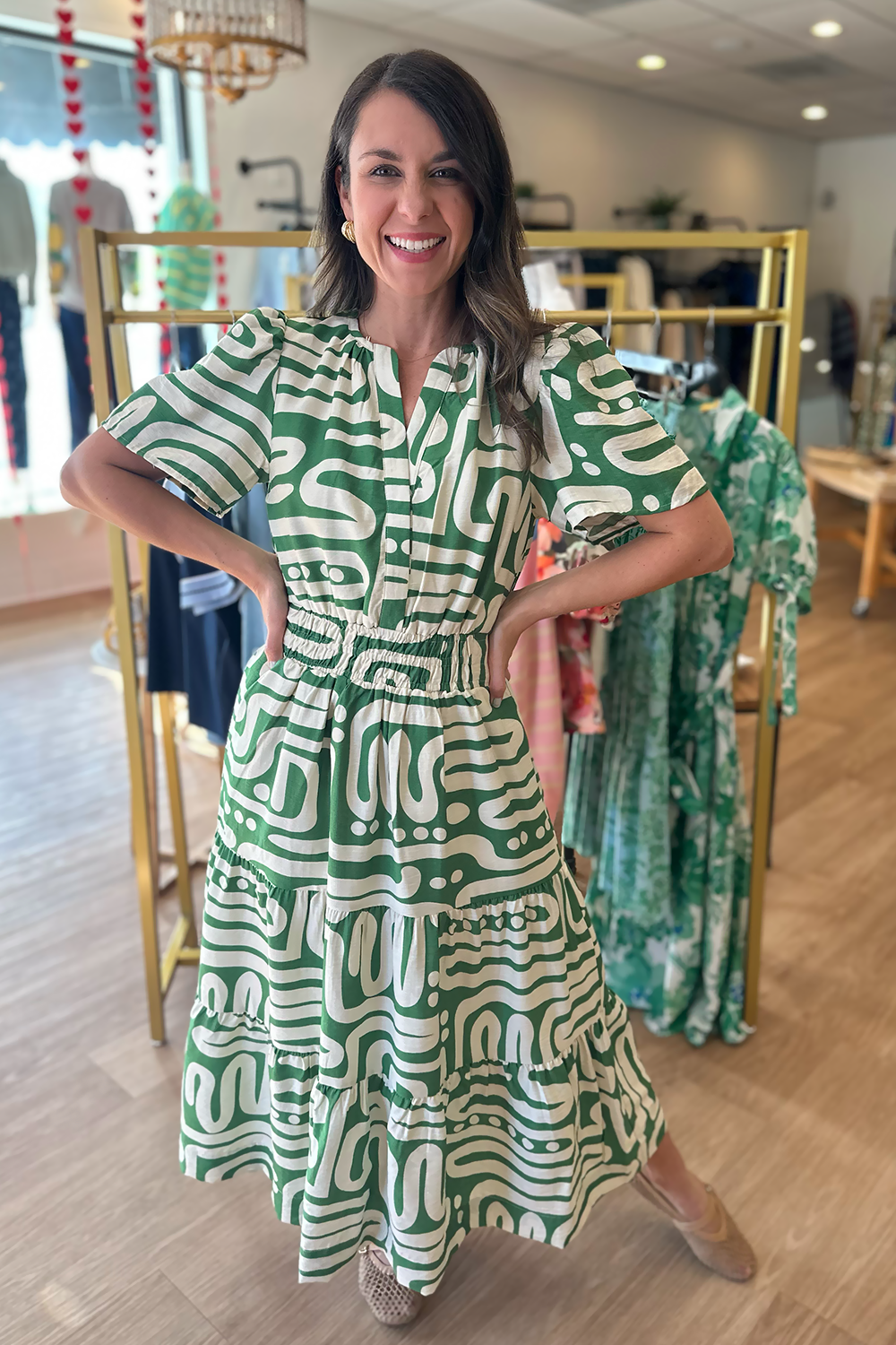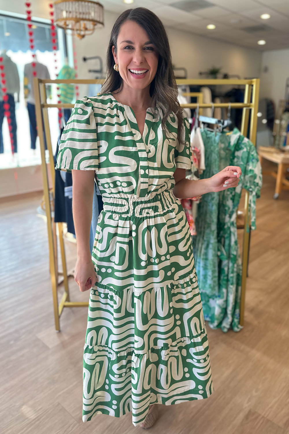 Elevate your warm-weather wardrobe with our Green Pattern Short Sleeve Midi Dress. This stunning dress features a beautiful green and ivory pattern that exudes effortless elegance and feminine charm, perfect for any occasion from brunch to garden parties.