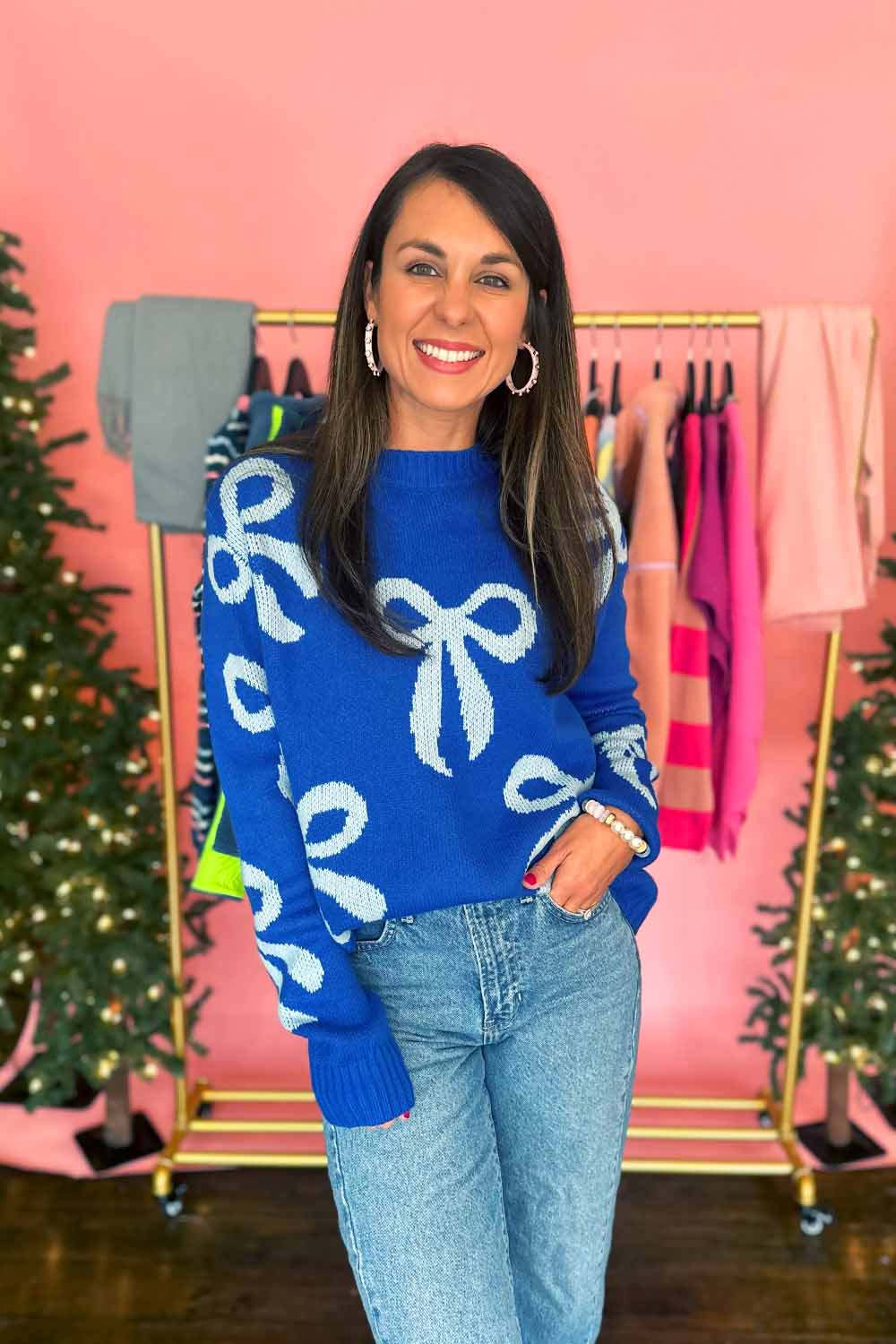 Embrace your playful side with this bright royal blue sweater adorned with charming light blue bows scattered throughout. The classic crew neck design offers timeless comfort, while the whimsical bow details add a girly, fun twist perfect for expressing your personality. Soft, cozy, and undeniably cute—this sweater is your go-to piece for standing out with style and charm. Model is wearing a size small.