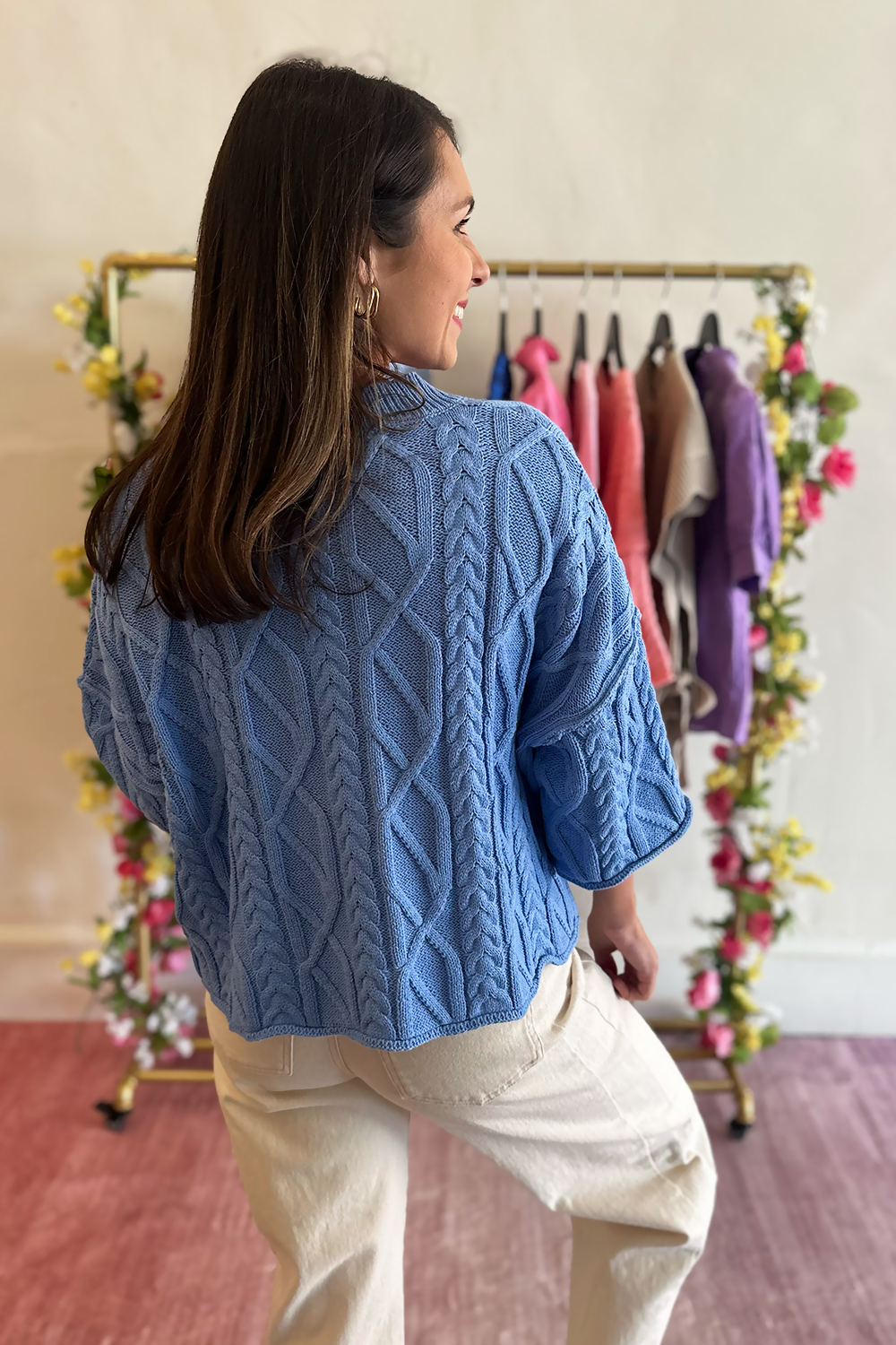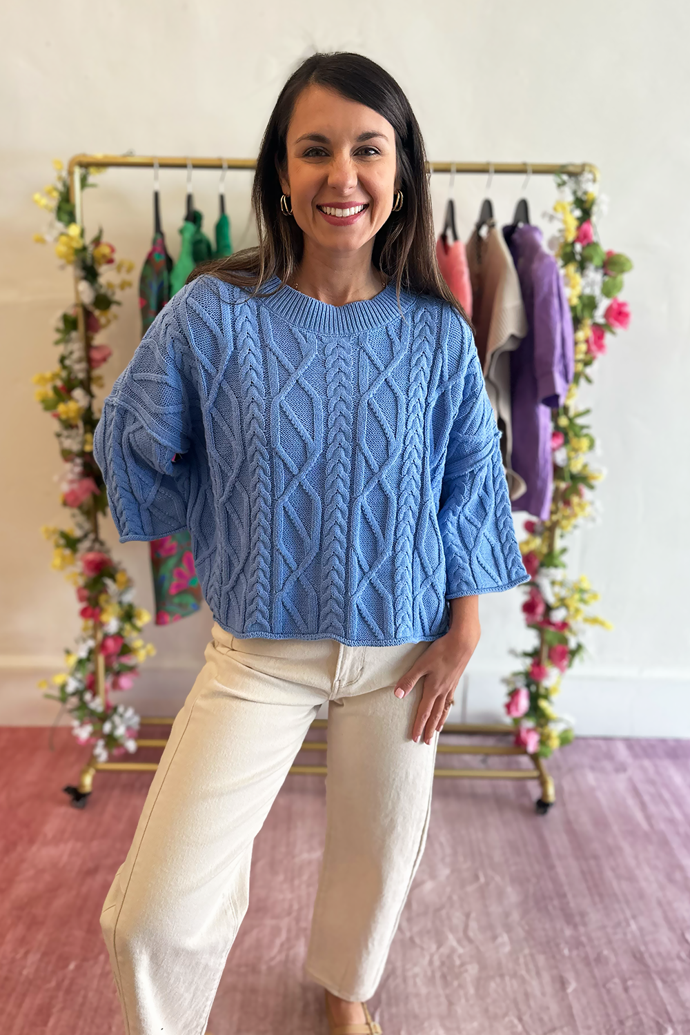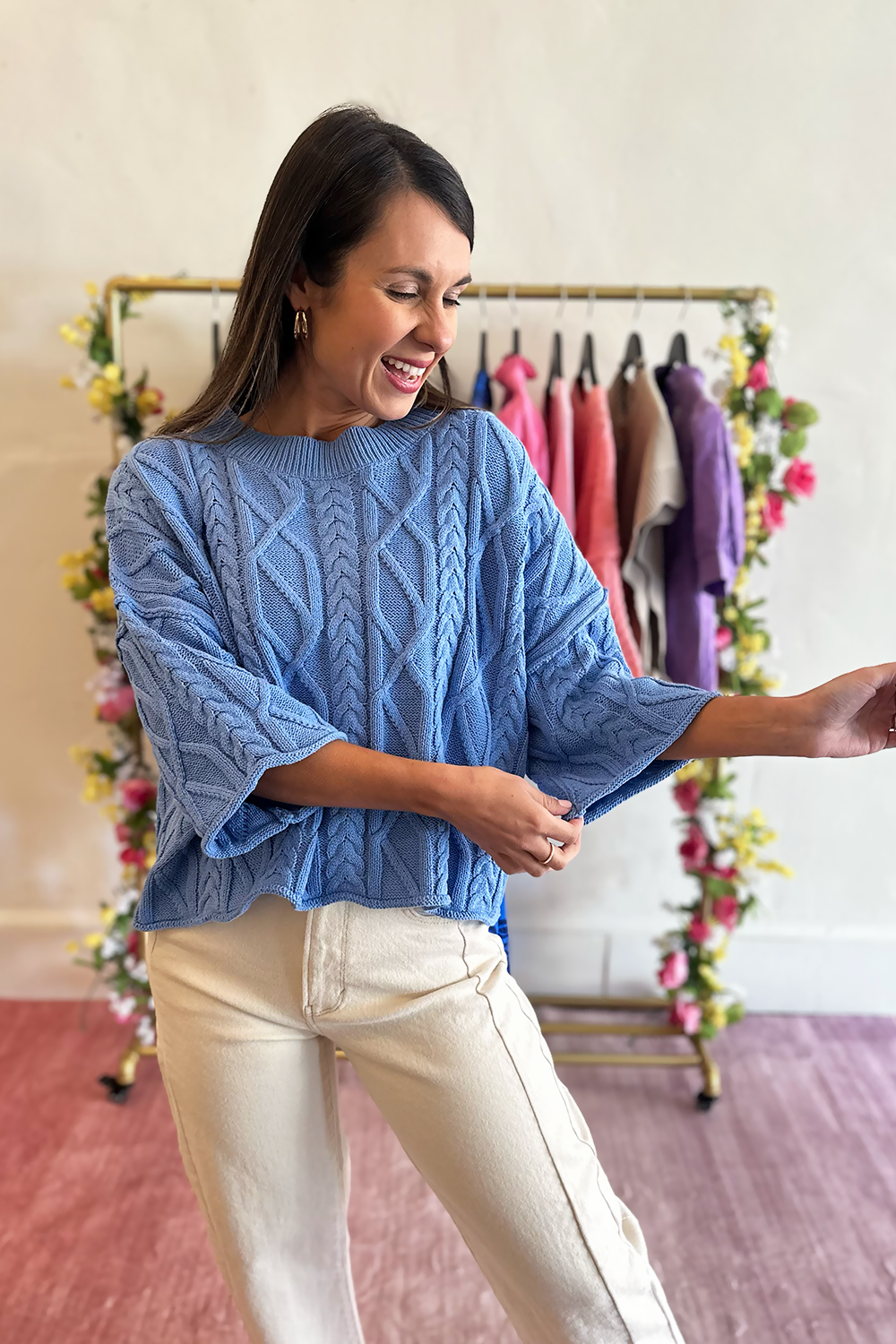 Embrace effortless style with this boxy cable knit top in a soft blue hue. The classic cable knit texture adds timeless charm, while the relaxed, boxy silhouette creates a modern, laid-back look that's perfect for layering or wearing on its own.