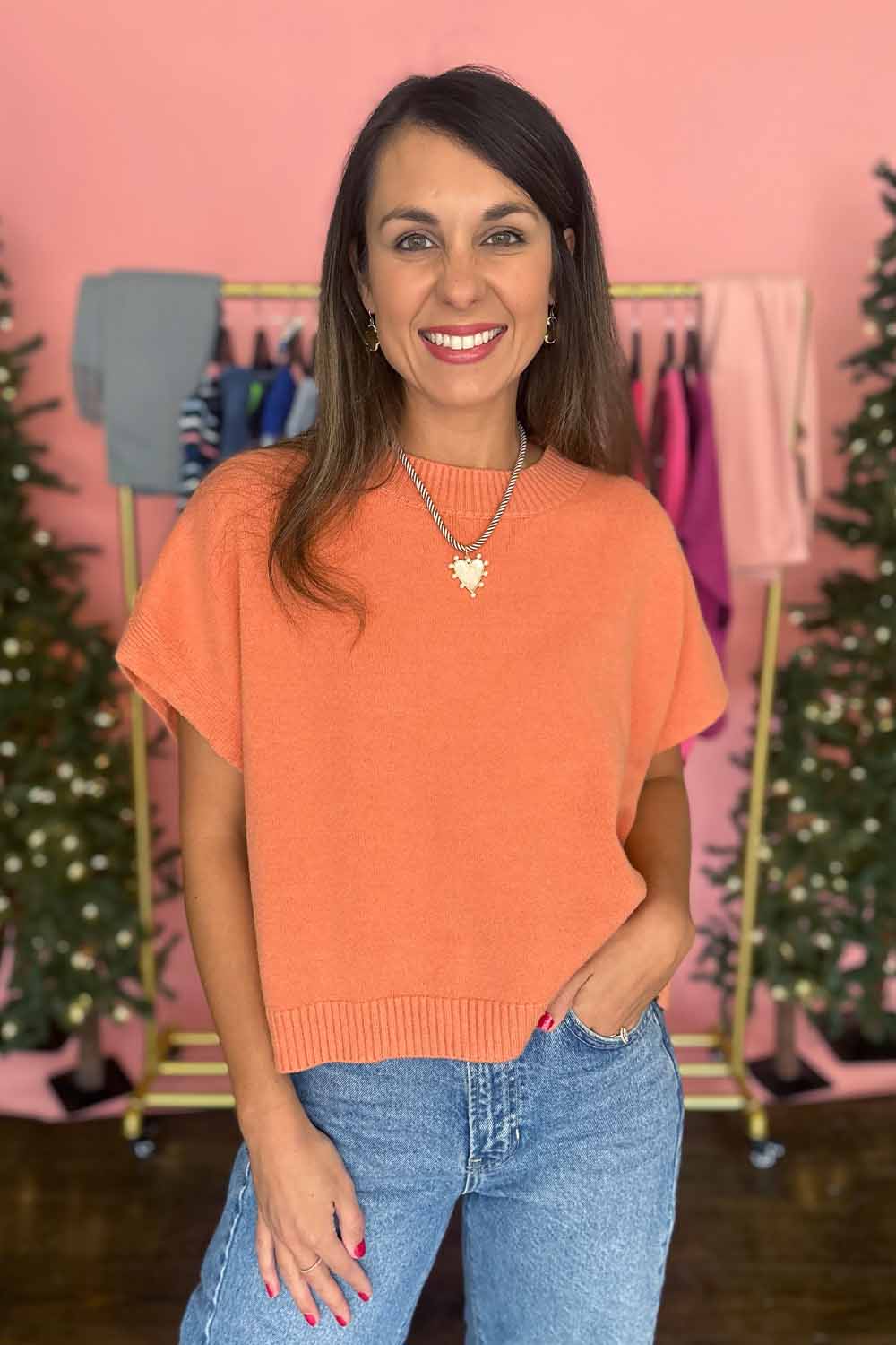 Throw on this effortless short-sleeve sweater and instantly level up your casual game. The relaxed boxy silhouette pairs perfectly with the soft drop shoulders for that laid-back, cool-girl vibe. This fun coral color makes it the kind of piece you'll reach for again and again—whether you're running errands or keeping it cozy at home. Model is wearing a size small.