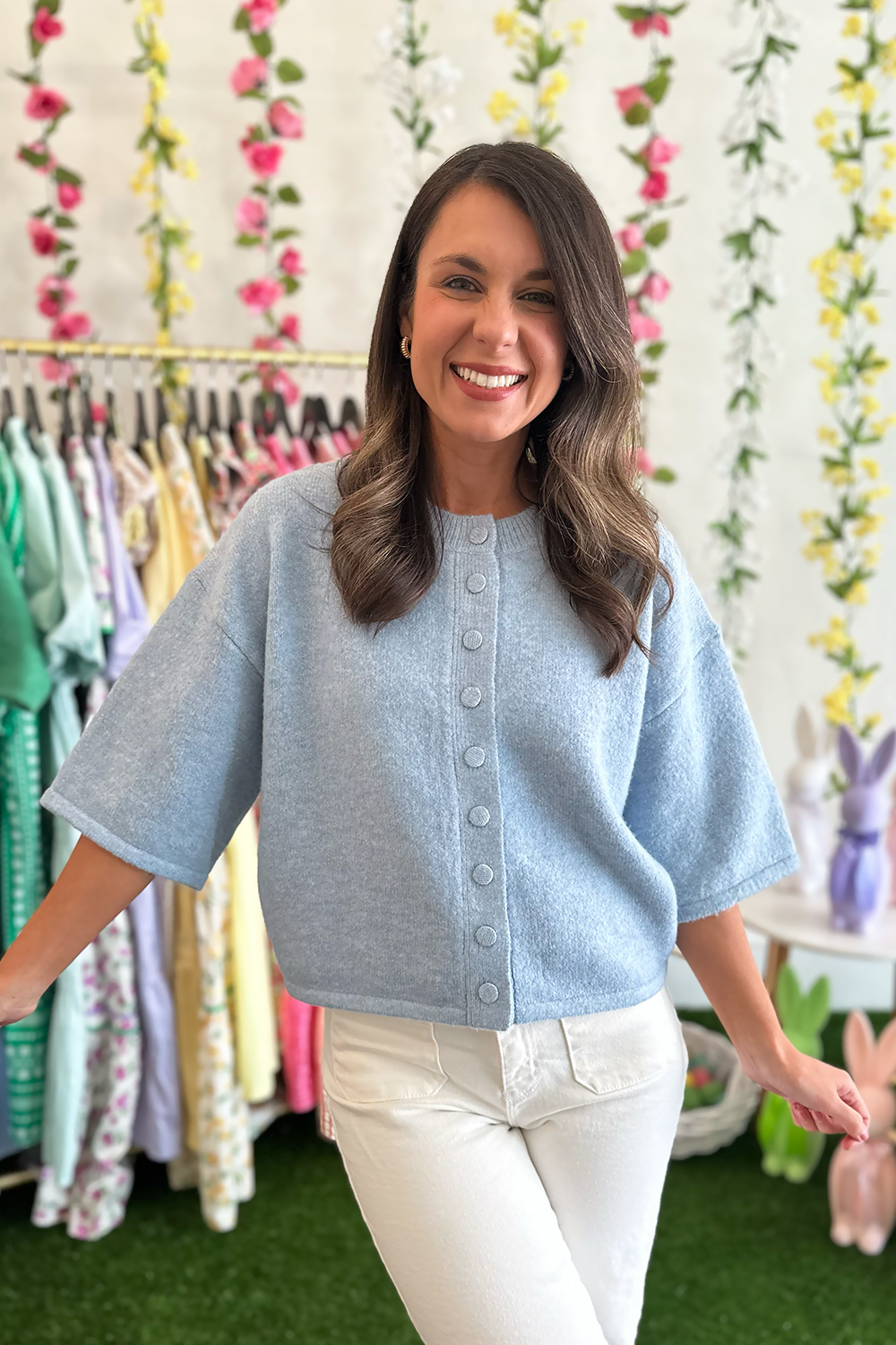 Your spring wardrobe just got a major upgrade! This Blue Short Sleeve Button Sweater is the versatile layering piece you didn't know you needed. The fresh blue hue and classic button-front design make it perfect for those unpredictable spring days when you need style and comfort in equal measure.