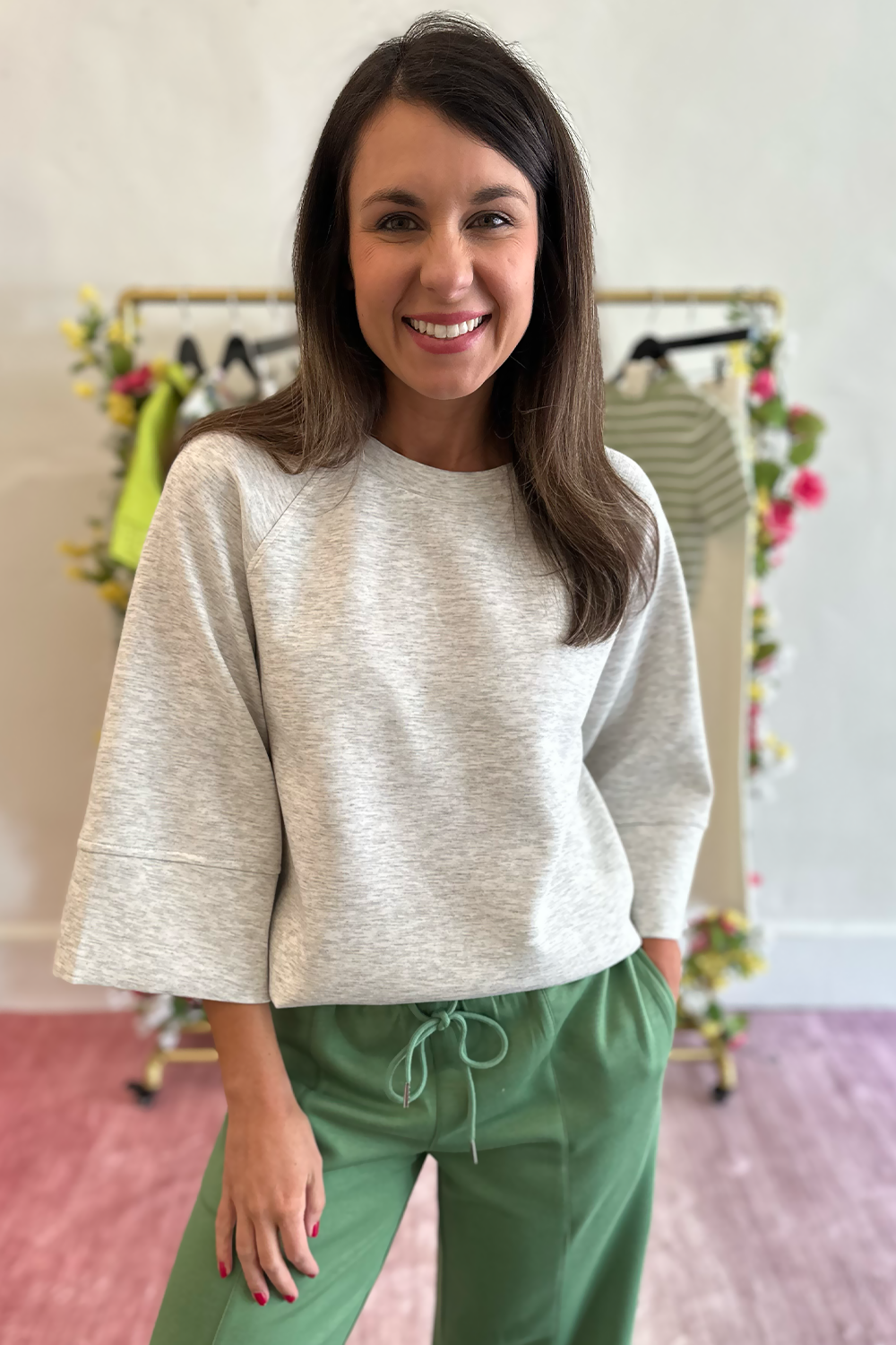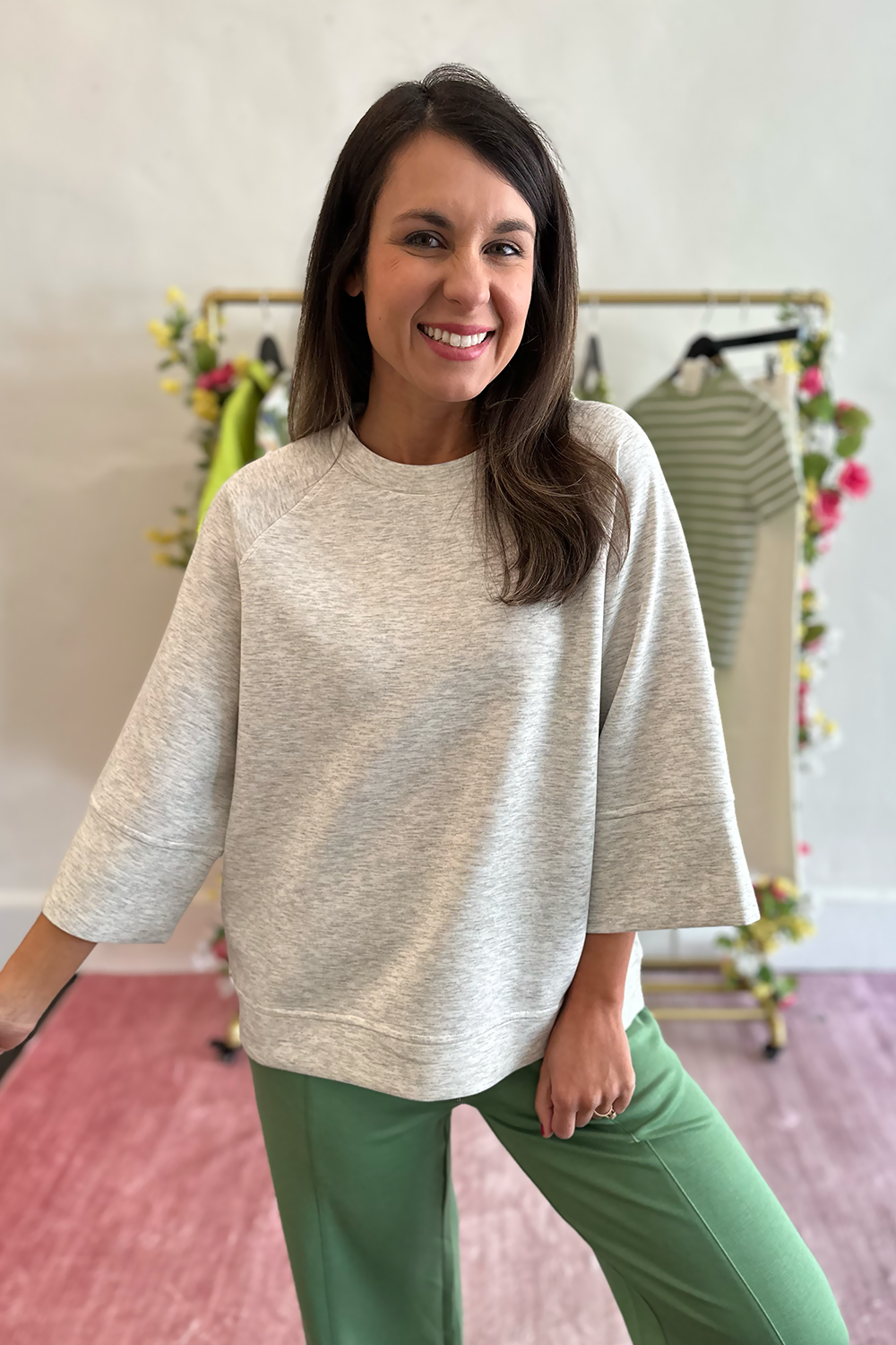 Experience the perfect blend of comfort and style with this buttery-soft athleisure top that feels like a second skin. The relaxed 3/4 length sleeves offer flattering coverage and easy movement, while the premium heather gray fabric delivers that coveted luxe-lounge aesthetic that transitions effortlessly from studio to street.