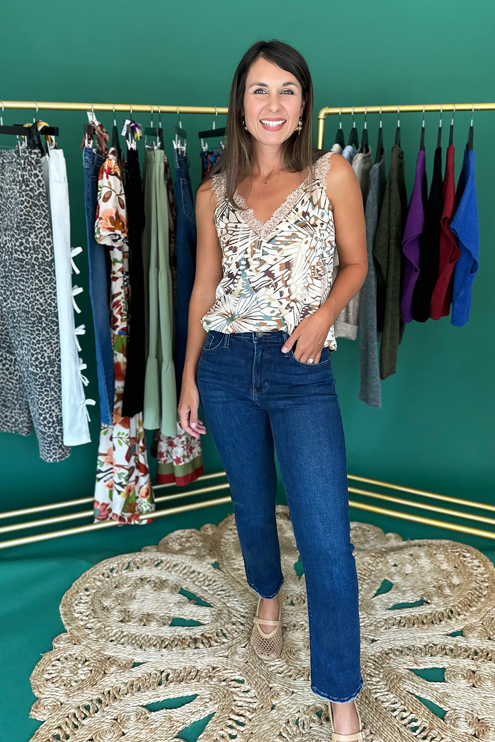 Elevate your wardrobe with this silky tan and brown patterned cami, featuring a refined V-neckline accented with delicate lace trim. Its feminine and girly design offers versatile elegance—wear it alone for a soft, sophisticated look or layer under cardigans and jackets to add subtle charm to any outfit. Model is wearing a size xsmall.